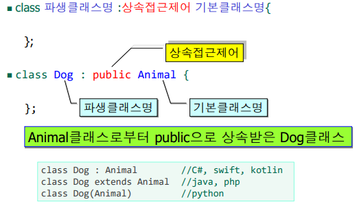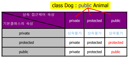 - protected: 기본 클래스에서 protected로 선언된 멤버는 public 상속을 통해 파생 클래스에서 protected로 접근할 수 있다. (즉, Dog 클래스에서 접근 가능하지만 외부에서는 접근 불가)