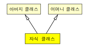- 아버지와 어머니 클래스를 아들 클래스가 물려 받는 것 ( java, c#, svift 등에선 지원하지 않음 대신 비슷하게 동작하는 다른 게 있음)
