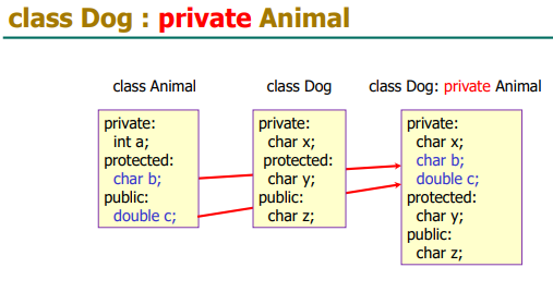 - 기본클래스의 private 멤버는 private 멤버로 남고, 파생 클래스의 의해서 접근될 수 없다.