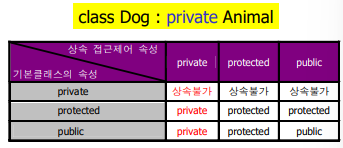 - 표의 첫 번째 열은 기본 클래스 Animal의 멤버 접근 제어를 나타낸다. 각 행은 private, protected, public의 세 가지 접근 수준을 보여준다.