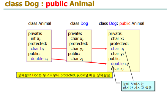 - 표의 맨 위에는 class Dog : public Animal이라는 문구가 있다. 이는 Dog 클래스가 Animal 클래스를 public으로 상속받고 있음을 나타낸다.